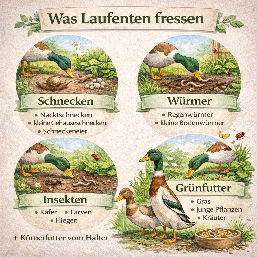 Laufenten fressen praktisch alle Schneckenarten, die sie erwischen können: Nacktschnecken aller Arten (auch die Spanische Wegschnecke), kleine Gehäuseschnecken, Schneckeneier im Boden und Jungschnecken. Große Gehäuseschnecken wie die Weinbergschnecke werden dagegen meist gemieden, weil ihr Gehäuse zu hart und zu unhandlich ist.