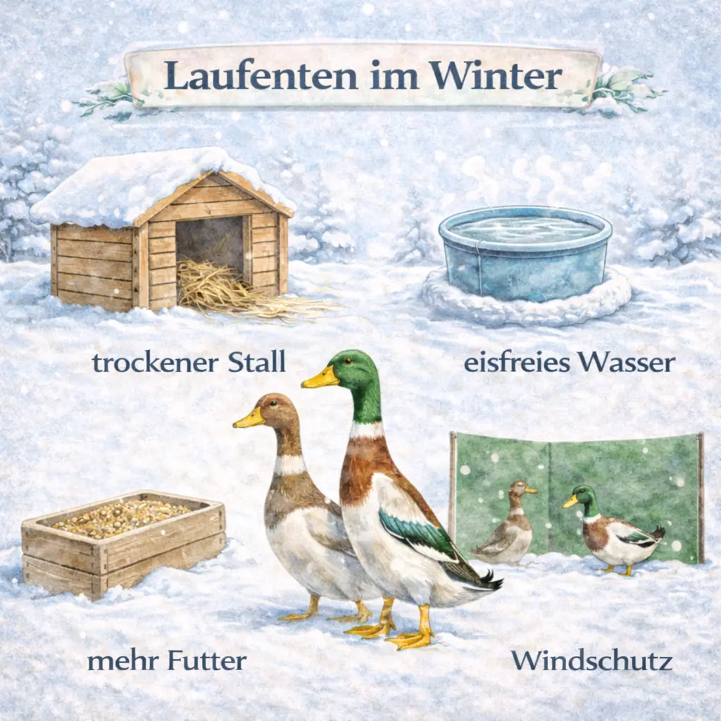 Laufenten sind relativ kälteresistent. Ihr dichtes Gefieder hält Kälte bis weit unter null Grad aus – vorausgesetzt, sie sind trocken und der Stall ist zugluftfrei. Was gefährlich wird: Feuchtigkeit im Stall kombiniert mit Kälte. Ein nasses, zugiges Quartier ist der häufigste Auslöser für Atemwegserkrankungen im Winter.