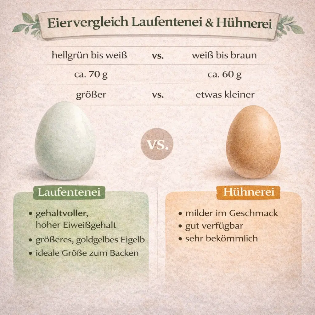Laufenteneier sind größer als Hühnereier und haben einen deutlich kräftigeren, leicht intensiveren Geschmack. Das Eigelb ist tiefer orange und cremiger. Für Rührei und Spiegelei sind sie eine Delikatesse – und in der Bäckerei gelten Enteneier als Geheimtipp für besonders fluffige, saftige Kuchen.